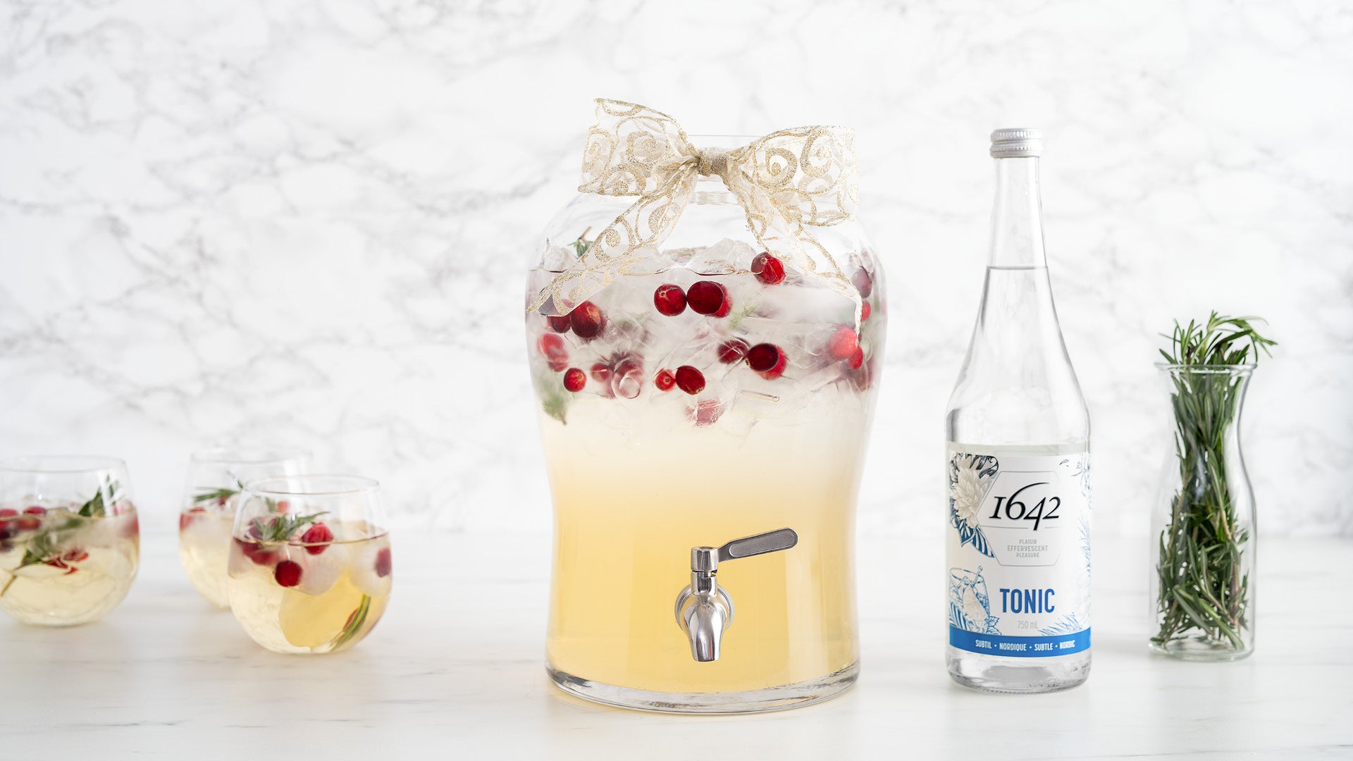 RecetteUn punch éclatant où hibiscus, canneberges, lime et tonic 1642 s’unissent pour offrir une gorgée festive, parfumée et joyeusement lumineuse.